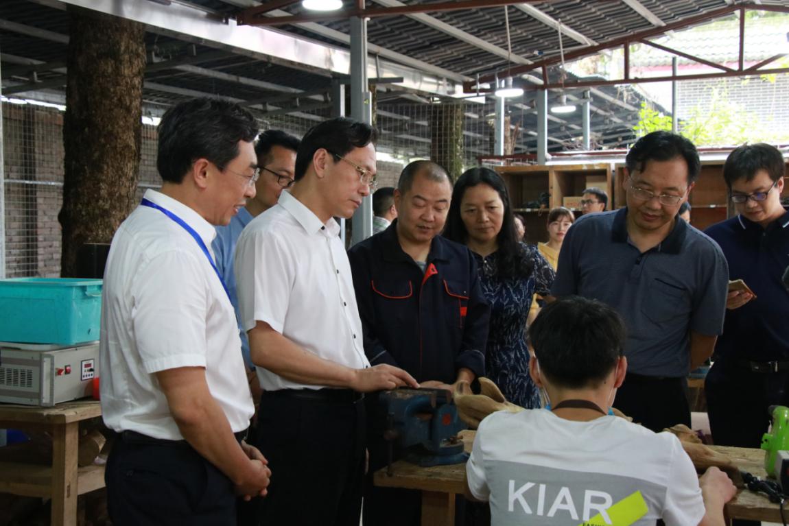 在根雕实训室,李江一行看望了正在创作根雕作品的学生,了解了学校依托民间传统工艺专业,聘请省级工艺美术大师开展现代学徒制试点,已培养出两名省级工艺美术大师和一名省级农村手工艺大师的傲人业绩等情况。