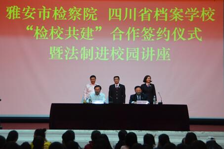 4月19日下午,雅安市人民检察院、四川省档案学校“检校共建”合作签约仪式在学校大礼堂隆重举行。市检察院检察长刘孝勇,副检察长赵学东,检委会专职委员张杰及检察官郑翔文应邀出席。