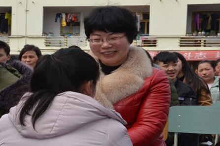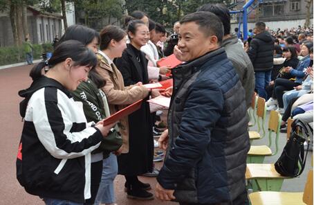 颁奖仪式分两批进行。先进班集体和文明寝室的获奖单位派代表到主席台前领奖,先进学生个人则到家长面前,由父母亲自颁发荣誉证书。在这个特殊的颁奖现场,学校精心组织了获奖学生感恩回馈父母活动。接过证书的孩子们围绕在父母膝前,摸一摸父母辛勤劳作的双手,理一理爸妈已悄然生出的白发,揉一揉他们的肩膀,对他们道声真挚的谢谢,互相说说心里话。看着面前优秀懂事的子女,父母眼里噙满了欣慰的泪水。学生、家长的互动也感动了在场的每一位人,大家深情共唱《感恩的心》,并给予相邻的同学、同事“感恩拥抱”。