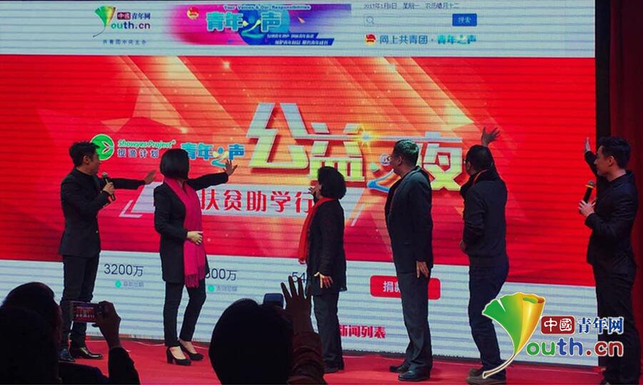 指尖传递公益,汇聚爱心。为推动互联网与公益慈善事业的深度融合与发展,释放互联网公益慈善的潜力,让更多的人践行“指尖公益”的新理念,活动现场,撒贝宁、舒冬、高潮东、王筱磊、沙玛阿果、张华敏、金波作为爱心志愿者倡导推动“授渔计划・青年之声”精准助学项目,号召大家一帮一资助贫困学子。现场嘉宾通过手机扫描二维码捐赠善款,运用互联网众筹理念为困境青少年和爱心人士、爱心企业搭建“一帮一”公益平台。当晚活动所筹集得善款可以帮助到1303名贫困学生实现上学的梦想。