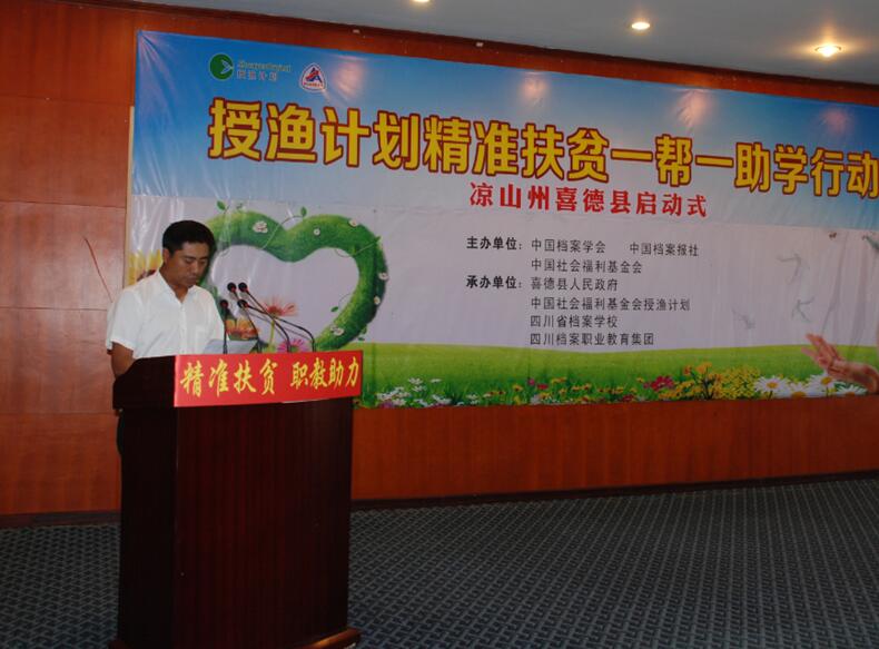 启动式由中国档案学会、中国档案报社、中国社会福利基金会主办,喜德县人民政府、中国社会福利基金会授渔计划、四川省档案学校、四川档案职业教育集团承办。旨在通过中国社会福利基金会“授渔计划”,帮助300名喜德县的贫困学生到四川省档案学校就读,2年时间内,为每人提供6000元生活资助,帮助其完成中等职业教育和后续的成人大专教育,掌握一门专业技能,实现高质量就业,从而达到阻止贫困代际传递的目的。
