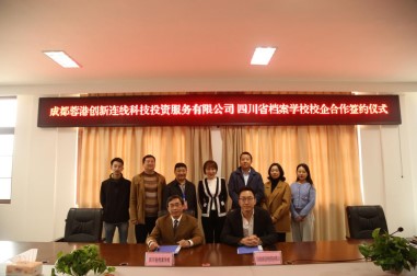 成都蓉港创新连线科技投资服务有限公司培训部总经理都浩、企划总监霍海铃、总经理助理柴琦、档案校副校长童以鸿和相关科室负责人参加签约仪式。