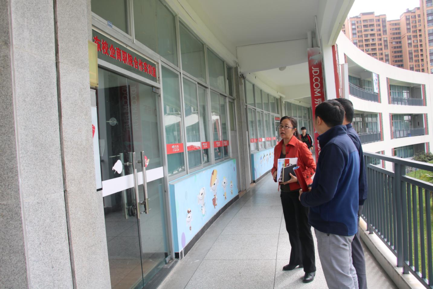 王琦副主任正在介绍与京东商城建立的校企合作实训室及去往京东实习的100多名学生的实习情况