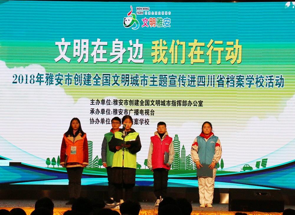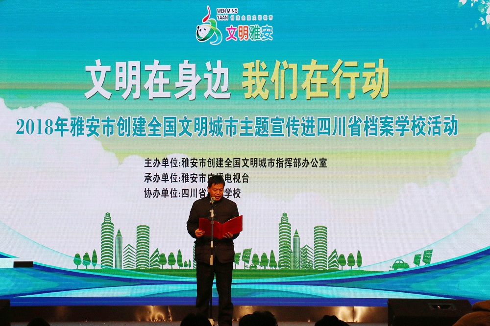 12月12日,2018年雅安市创建全国文明城市主题宣传走进四川省档案学校。雅安市文明办副主任唐世平,雅安市教育局党委委员、副局长姜建平,学校党委副书记、纪委书记李富民等同志出席会议。雅安职业技术学院、雅安中学、雅安市田家炳中学、四川省档案学校、雅安七中师生代表和相关新闻媒体共600余人参加此次活动。