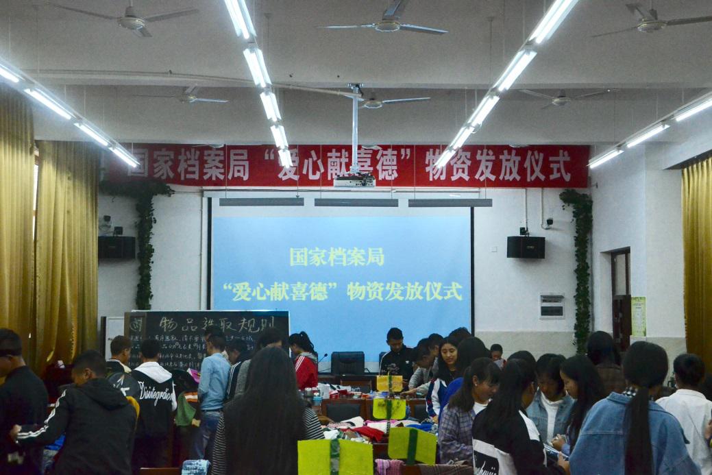 3月29日,国家档案局“爱心献喜德”物资发放仪式在四川省档案学校综合楼阶梯教室举行。