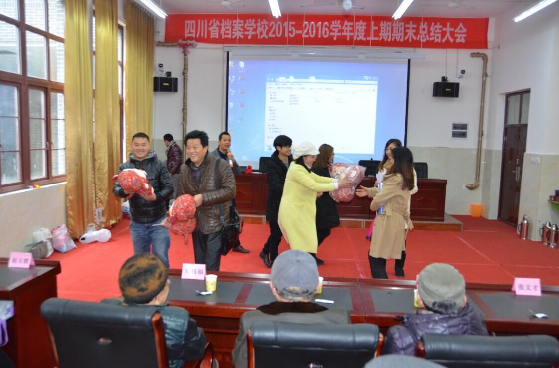 总结大会由学校党委副书记、副校长张其可主持,全体在岗、离退休教职工参会。会上,学校党委书记、校长徐宏首先传达了全省档案局长馆长会议精神。接着,徐宏校长发表了题为“打基础 立长远 取得较好成绩”的总结讲话,他分别从灾后重建、学校招生就业、安全保卫、教育管理、教学改革、继续教育工作、教研科研、后勤保障、“三严三实”专题教育、精准扶贫工作等方面进行了总结。本学期学校承办了全国“创新杯”文秘说课大赛和“‘青年之声・授渔缘梦’精准扶贫一帮一助学行动”活动。两次大型活动的成功举办,既扩大了学校的社会影响力,提升了学校知名度和美誉度,使学生得到了实实在在的资助,又使全校教职工得到了承办大型活动的锻炼。会上,徐宏校长代表党政班子向辛勤付出的全校教职工表达了感谢和敬意,并祝大家新春快乐!