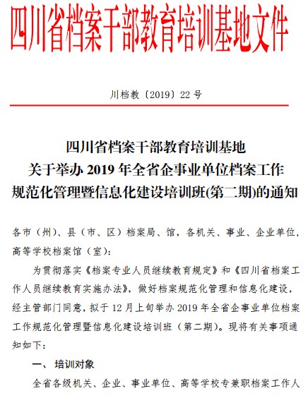 关于举办2019年全省企事业单位档案工作规范化管理暨信息化建设培训班(第二期)的通知