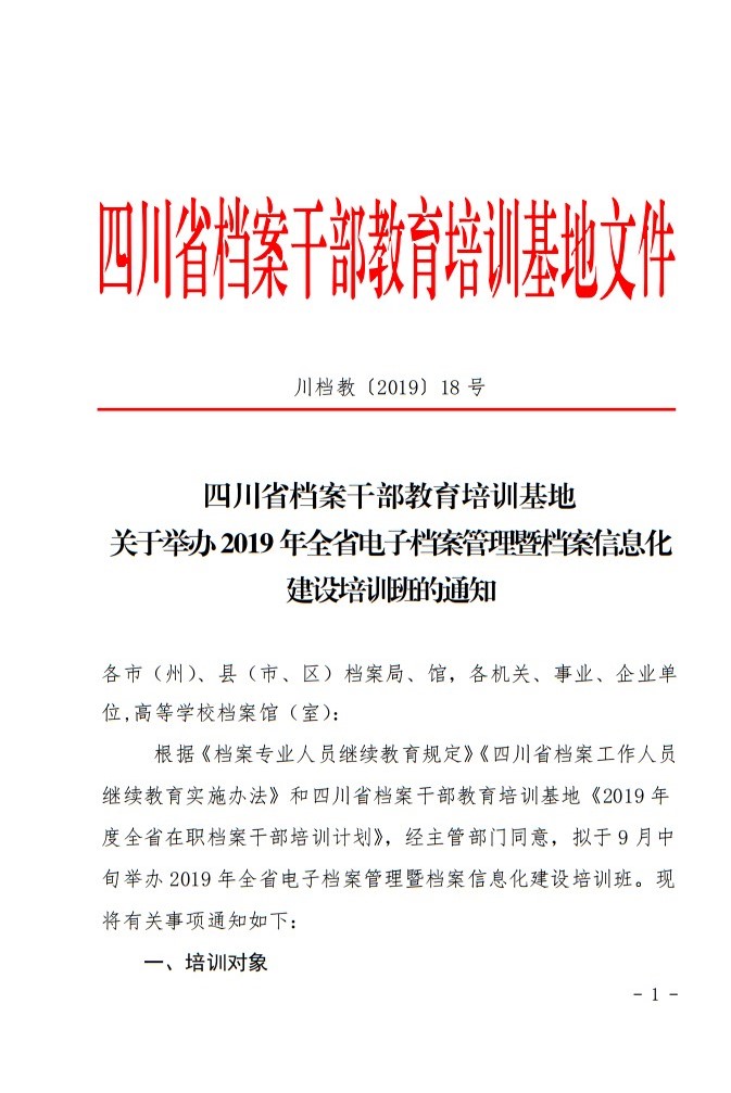 关于举办2019年全省电子档案管理暨档案信息化建设培训培训班的通知