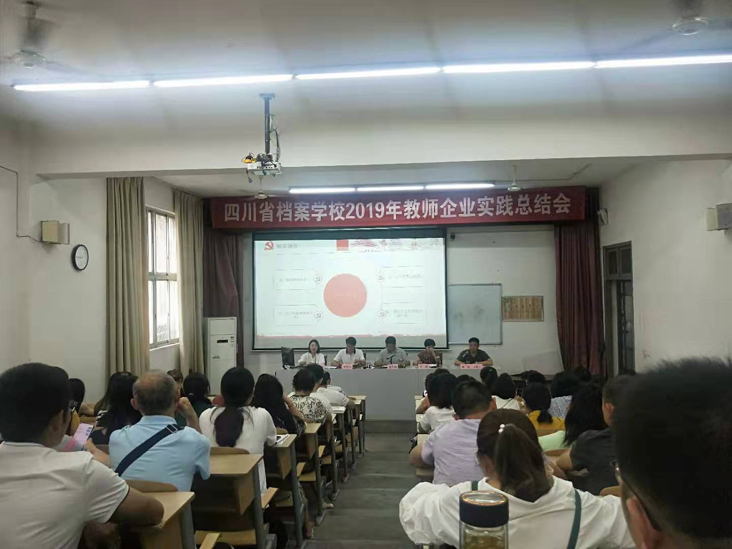 2019年7月30日下午,四川省档案学校2019年教师企业实践总结会在综合实训楼一楼阶梯教室召开。本次会议由教务科科长黄皓主持,学校副校长童以鸿、伍琼、党委副书记、纪委书记李富民出席了会议,诊改办、示范办办公室主任李萍、办公室、招生就业办主任王三刚及企业实践的全体教师参加了此次会议。