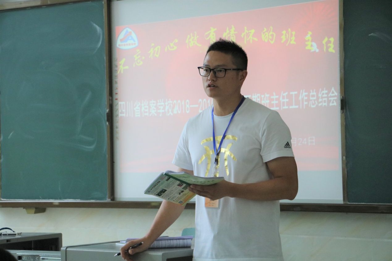 会议伊始, 2018级班主任施宏科首先做了发言,分享他参加北京学汇百川教育科技研究所举办的“中职班主任基本功培养暨班级管理能力提升高级研修班”的学习体会。他讲到关爱学生是师德的灵魂,中职院校的德育工作确实很艰辛,但去做有挑战的事其实更有意义,这背后的成就感、满足感也就只有职校教师才能体会。只要班主任用心把学生在四川省档案学校的人生第一粒扣子扣好,他们的潜力将会是无穷的。教育教学之路任重而道远,愿与各位班主任老师共同努力。