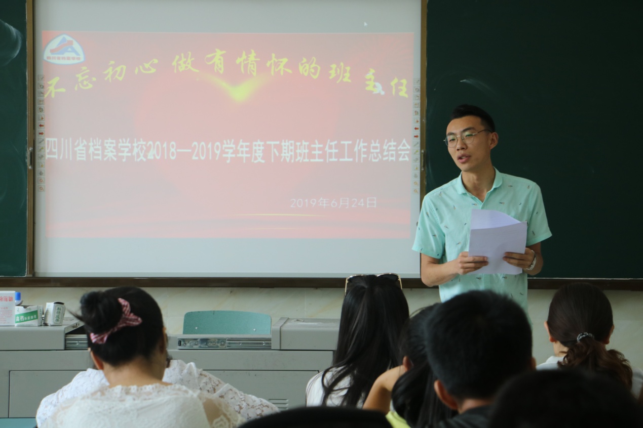 班主任工作任重而道远,这次会议,必将指导班主任老师扎实有序地开展班级管理中的各项期末工作,从而为学校本学期的工作画上一个圆满的句号。我们四川省档案学校的班主任团队也将会在取得成绩的肯定中、改进工作的不足处,积蓄动力源,在今后的班主任工作中一路策马扬鞭,奋勇向前。