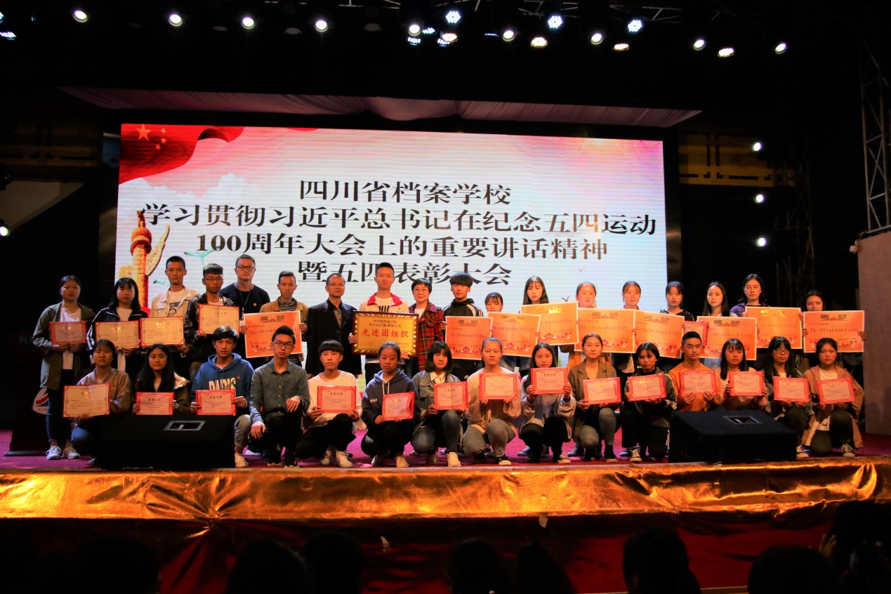 为了纪念“五四”运动100周年、建团97周年和新中国成立70周年, 5月29日下午16:30,四川省档案学校在大礼堂举行学习贯彻习近平总书记在纪念五四运动100周年大会上的重要讲话精神暨五四表彰大会。学校副校长伍琼,学校党委委员、工会副主席、离退办主任程在伦,学生科科长郑术兵出席了会议,会议由校团委师泽波老师主持,500余名团员青年代表参加。