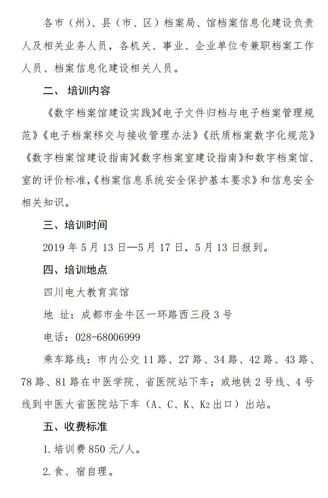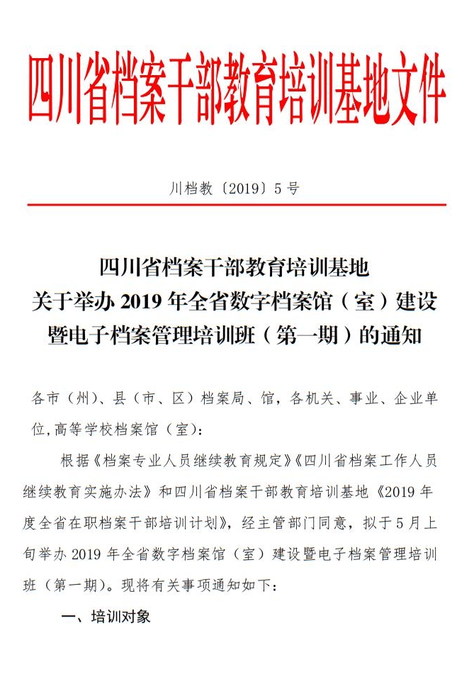 四川省档案干部教育培训基地关于举办2019年全省数字档案馆(室)建设暨电子档案管理培训班(第一期)的通知