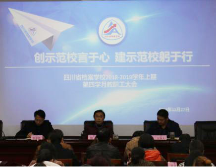 会上,学校创建办主任李萍通报了省级示范学校建设的相关工作,四川省档案学校示范校建设方案和任务书已于2018年11月12日获得省教育厅、省人事厅、省财政厅的批复,现已正式进入建设阶段,她号召全体教职工各尽其能,积极参与到建设中去。周艳还代表示范校建设赴重庆培训的教师分享了心得体会。学校保卫科、学生科、教务科负责人围绕本科室工作,总结了第三学月工作,并对第四学月工作作了安排。