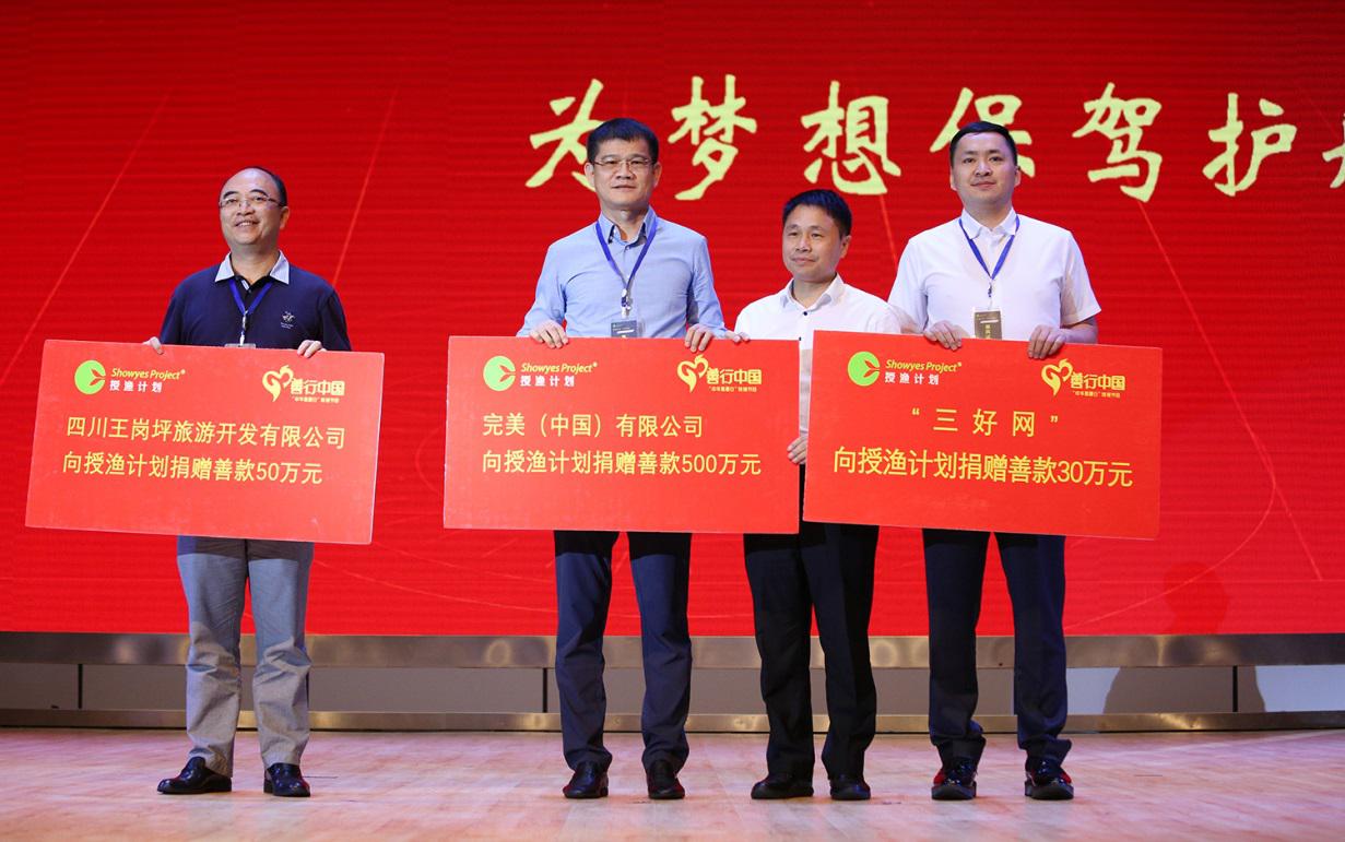 为进一步推动授渔计划“教育均衡” “平安成长”等项目的扶贫举措落实到更多地区,爱心企业完美(中国)有限公司捐赠善款500万元,四川王岗坪旅游开发有限公司捐赠善款50万元,三好网捐赠30万元,中国社会福利基金会授渔计划秘书长高继辉代表授渔计划接受捐赠。四川省政协副秘书长、民建四川省委专职副主委王元勇,四川省教育厅职成处副处长罗亦凡、凉山州“9+3”驻蓉办主任王正友共同为三家爱心企业负责人颁发了荣誉证书。