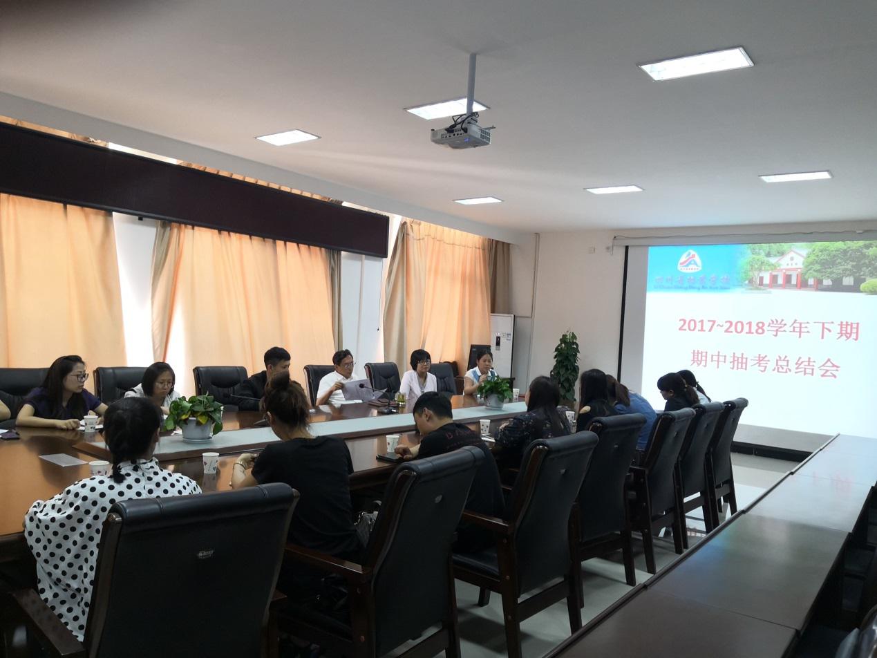 2018年5月22日下午,学校教务科在综合楼五楼会议室组织召开“四川省档案学校2017-2018学年下期期中抽考总结会”。语数外教研组组长、学前教育、档案管理专业教研组组长和相关骨干老师共计17名参加本次会议,主要就学校本次语数外期中考试和学前教育、档案管理专业抽考情况进行分析和总结。学校校长、校党委书记徐宏出席会议。