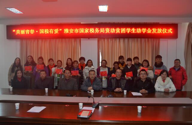 2017年12月25日,“美丽青春・国税有爱”雅安市国家税务局资助我校贫困学生助学金发放仪式在四川省档案学校举行。雅安市国家税务局机关工会主席王广文,副主席曾焰、周锐,四川省档案学校党委副书记李富民等相关人员参加活动。