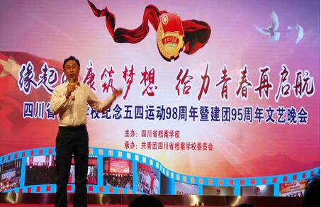 4月27日晚,为纪念“五四”运动98周年暨建团95周年及共青团四川省档案学校委员会成立30周年,弘扬爱国主义精神,“缘起西康筑梦想・给力青春再启航” 五四主题晚会在学校大礼堂隆重举行。共青团雅安市委副书记陆艳,四川省档案局宣教处干部白晨皓,雅安市教育局职成科干部钟洁,校党委书记、校长徐宏,校党委副书记、副校长张其可,副校长童以鸿出席晚会。