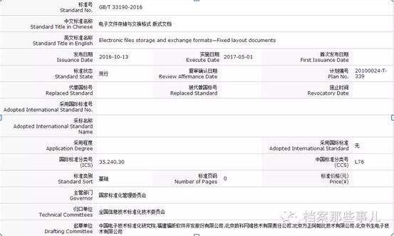 2016年10月13日,在世界标准日前夕,国家标准委发布2016年第17号中国国家标准公告,发布国家质检总局和国家标准委批准的315项最新国家标准。其中,电子文件管理的标准也在此列,包括《电子文件管理装备规范》(GB/T 33189-2016)和《电子文件存储与交换格式版式文档》(GB/T 33190-2016)两项最新标准。