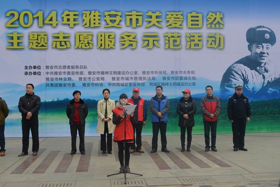 随后,我校团委宣传委员中专2012级1班刘思棋同学代表雅安市环保志愿协会向全市发出了《关爱自然保护环境共同守护雅安蓝天碧水生态家园》倡议书。