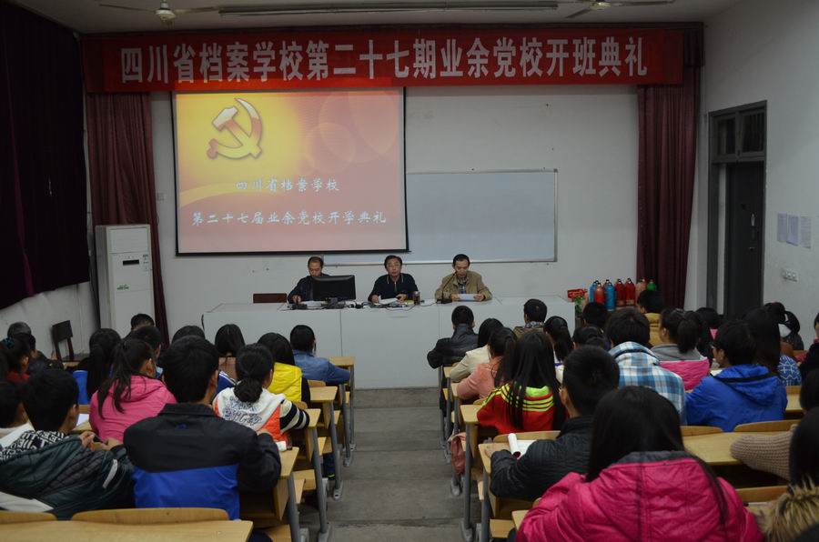 2013年11月4日晚7:30,我校第一党支部在教学楼阶梯教室隆重举行了第27期业余党校开学典礼。校党委书记徐宏、党委副书记张其可出席开学典礼。本次党校学员是经各班班主任推荐、第一党支部考察,自愿申请入党的德智体全面发展的2012级优秀团员,共76人。