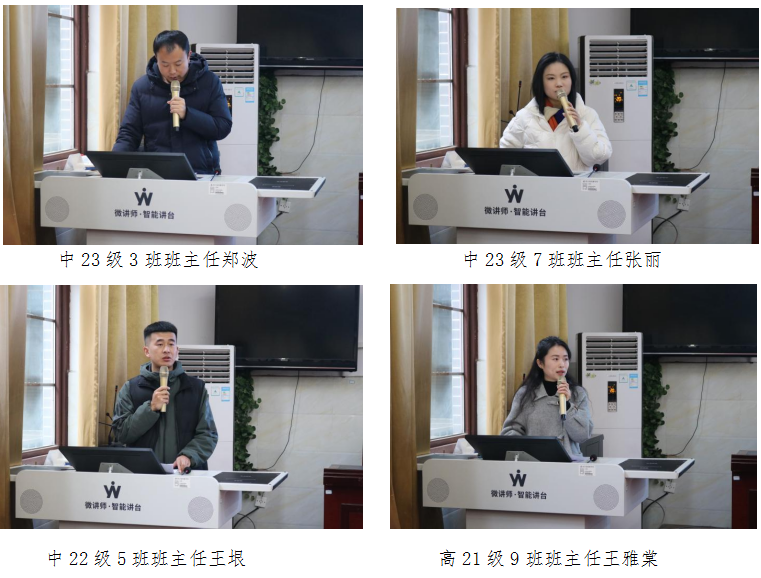 郑波老师以《我说我班》为题,围绕班级整体情况、工作感悟、班主任工作以及工作中的困惑与反思四个方面作了分享,感悟到对待学生要理性思考、对待班级要柔性管理。张丽老师以《亦师亦友伴花开 一束微光渐斑斓》为题,指出学生工作是一面镜子,班主任工作是一场修行,作为班主任老师要从行为习惯和思维观念来指导引领学生,要有情感、情怀、不放弃每一位学生。王垠老师以《爱字当头 五心并育》为题,呼吁全体班主任要有爱心、细心、宽容心、责任心、公平心,用爱成就学生,用爱引领学生。王雅棠老师以《我和我的班》为题,分享了做好班级管理的前提是要走近学生,增强班级凝聚力,比喻带班的过程就像培育鲜花,花开的过程虽然是漫长,但是用心浇灌,学生离校之日就是花开之时。学生科科长郑术兵以《“慧”做班主任,助力学校高质量发展》为题,从班主任的岗位职责、师德师风、学校对班主任工作的重视等方面,总结本学期班主任工作,安排下学期班主任工作。